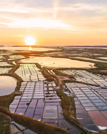 Por la tarde, elija su ritmo en función de su estado de ánimo. Descubra las Petites Cités de Caractère de Le Croisic y Batz-sur-Mer. Le Croisic, una península de cinco kilómetros en el mar, es una ciudad enriquecida por el comercio de la sal que ha sabido conservar toda su autenticidad. Pasee por el puerto, donde encontrará barcos de pesca y elegantes residencias de armadores, y luego piérdase por las callejuelas del centro medieval, donde las casas con entramado de madera son testimonio de un rico pasado. Continúe hasta Batz-sur-Mer, enclavada entre el océano y las marismas, donde la torre de Saint-Guénolé ofrece una impresionante panorámica de los alrededores.