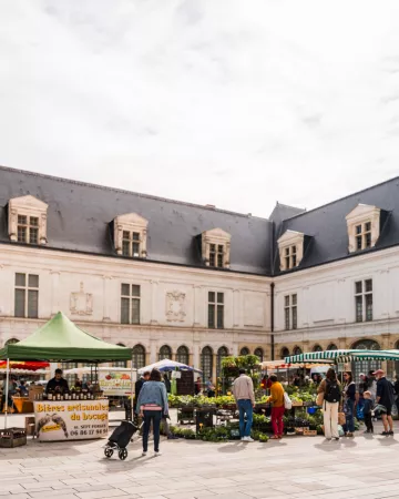 Cuando haya rellenado las respuestas de su cuaderno, ya será mediodía. Los martes y sábados por la mañana, deslícese entre los coloridos puestos del mercado de Laval. Tome asiento en La Cave du Château, que se transforma en bar de ostras todos los sábados por la mañana. Un clásico local que le sumerge en el arte de vivir de Laval.