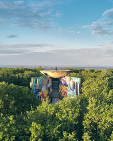 Es hora de subir los 108 escalones hasta el mirador del Mont des Avaloirs. Adornado con un fresco de Street Art, este edificio te eleva hasta el punto más alto del Grand Ouest (417 metros). Desde la cima, la panorámica de 360° abarca hasta 100 kilómetros a la redonda de tierras de labranza cercadas, huertos y bosques. Abajo, paneles explicativos cuentan la historia de este misterioso lugar.