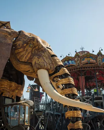 En el exterior, dos creaciones monumentales le esperan para completar su visita por todo lo alto. El Grand Éléphant, un coloso de madera y acero de 12 metros de altura, ruge orgulloso por la explanada. Suba a bordo y observe, desde el lomo de un elefante, el ballet mecánico de engranajes que impulsa esta catedral en movimiento. No muy lejos, el Carrousel des Mondes Marins le invita a sumergirse en un océano imaginario. A lo largo de tres plantas, extrañas criaturas marinas le llevarán en un viaje poético: cangrejos gigantes, peces pirata y medusas luminosas cobran vida, impulsados por los visitantes.