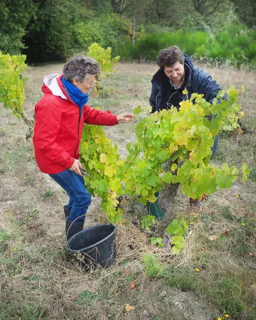 Después de dos horas de agradable trabajo, los cestos están bien llenos. Y ahora toca llevarlos hacia la camioneta. “Buen trabajo, chicos”, sonríe la propietaria. Nos dirigimos a una construcción pequeña de piedra donde Bruno Perray, enólogo de la casa, espera a los visitantes para invitarles a descalzarse y prensar los racimos con los pies. Después, pasarán a prensar su cosecha empujando con todas sus fuerzas la manivela de madera de la vieja prensa. El jugo que extraigan, llamado mosto, se embotella para que estos viticultores aficionados puedan llevarse una recompensa a su trabajo.